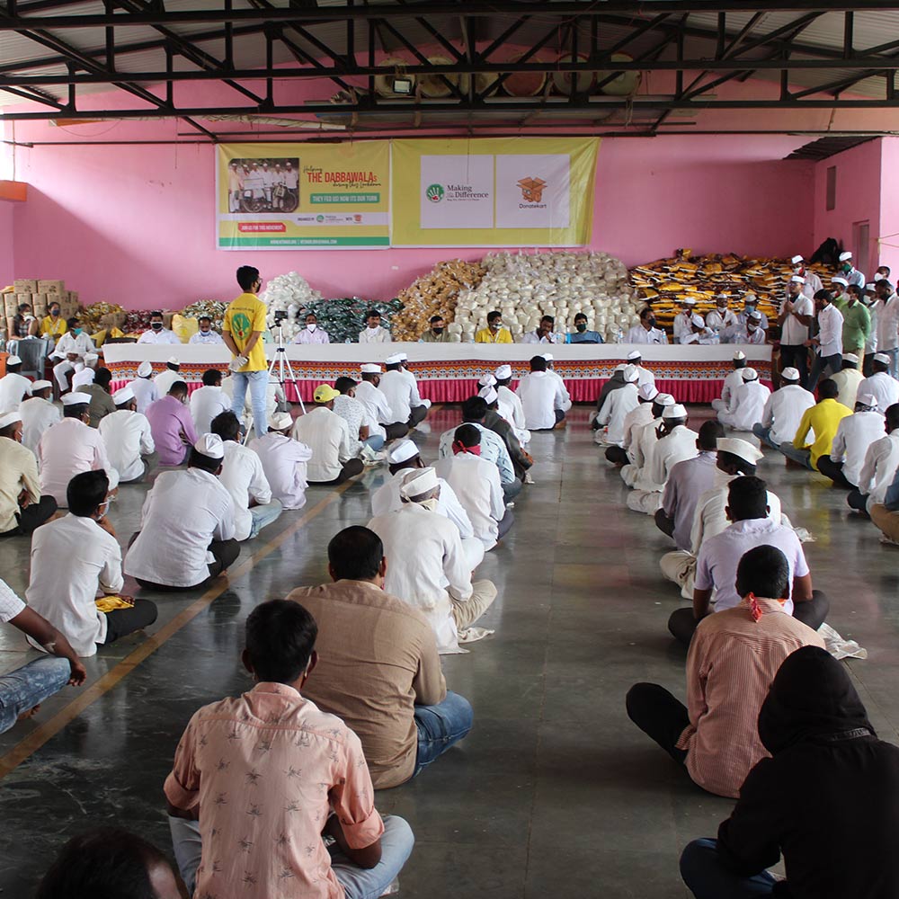 Archive photos from earlier on-ground drives — group meets, the Mumbai Dabbawala collaboration, Pune outreach and the 'Bhook Se Aazadi' campaign.